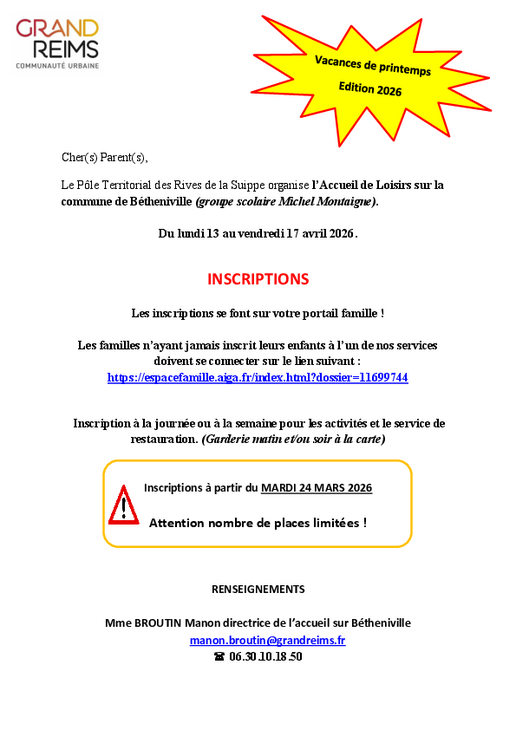 L’Accueil de Loisirs des vacances de Printemps s’est déroulé du lundi 7 au vendredi 11 avril 2025 au groupe scolaire de Bétheniville.