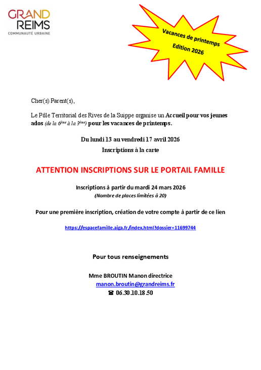 Bientôt les vacances de Printemps, n'hésitez pas à inscrire vos enfants à l'accueil qui à lieu au