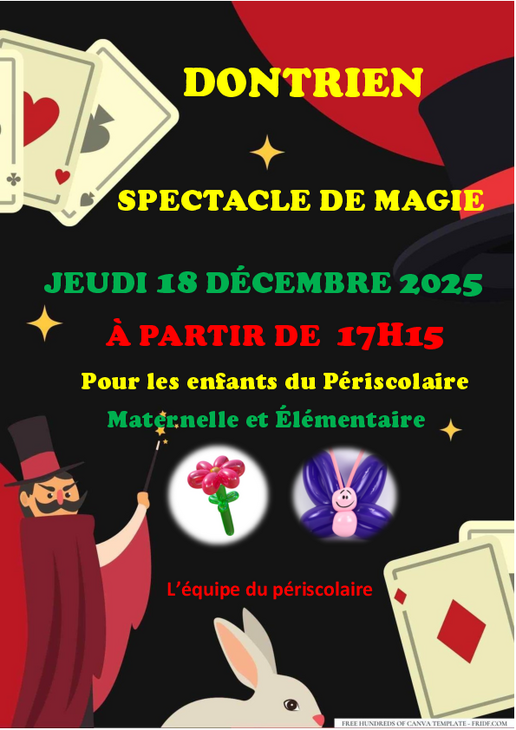 Cette année, le spectacle de magie aura lieu sur Dontrien le jeudi 18 décembre 2025. Moment plein de surprises et d'émerveillement pour les plus petits comme les plus grands.