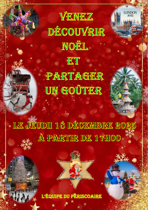 A l'occasion des fêtes de in d'année, les équipes du périscolaire ont le plaisir de vous inviter au goûter gourmand de Noël, moment convivial placé sous le signe du partage, chocolats chauds, friandises, brioches et distribution de chocolats pour les loulous.
